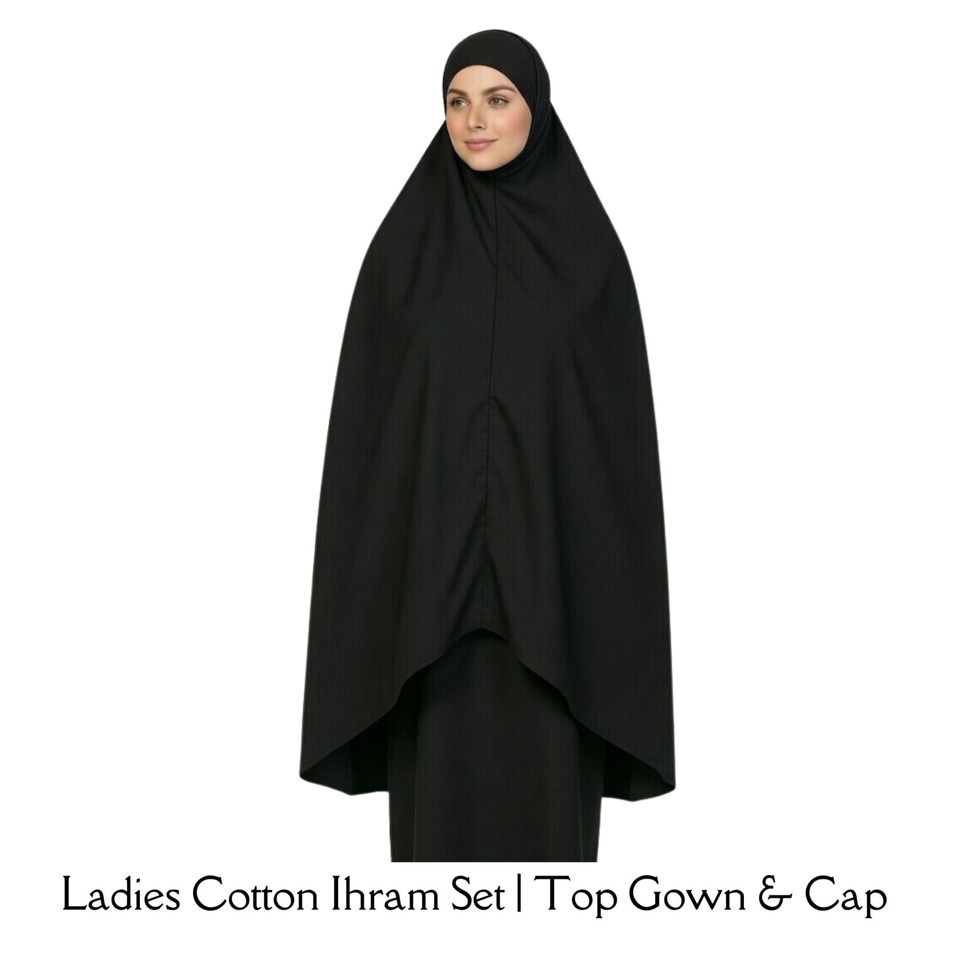 Our Ladies Cotton Ihram – Top Gown & Cap Set is made to support women during Umrah and Hajj. The breathable cotton fabric keeps you comfortable, while the loose gown design provides modest coverage and freedom of movement.